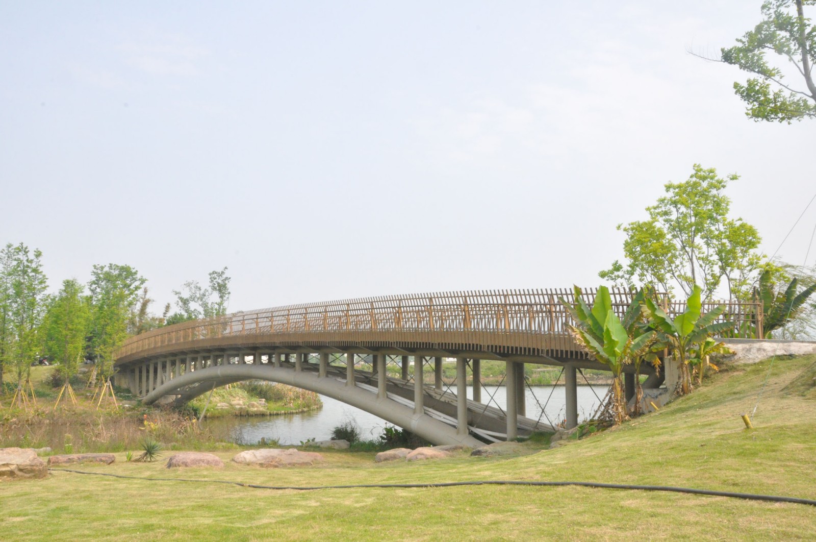 本工程橋平面位于R=65.1m的圓曲線上,連接三個島嶼。橋梁以橋梁中心點向兩側設置1.0%縱坡,橋梁跨徑組合為6x17.5m,中心線總長105m。本橋結構為采用鋼結構等截面連續(xù)梁結構,梁高750mm,采用3道14mm腹板,頂、底板為14mm鋼板,主梁及橋面板通過道橫隔板聯(lián)系成整體。腹板間距為1.5m,兩側設置0.75m懸臂。鋼箱梁寬4.5m,底板橫向共設6 道縱向板式加勁肋,底板厚14mm;腹板中心間距1.5m,腹板厚14mm;鋼箱梁上翼板寬為0.75m,鋼板厚度14mm,鋼內設橫隔板,間距1.5m。