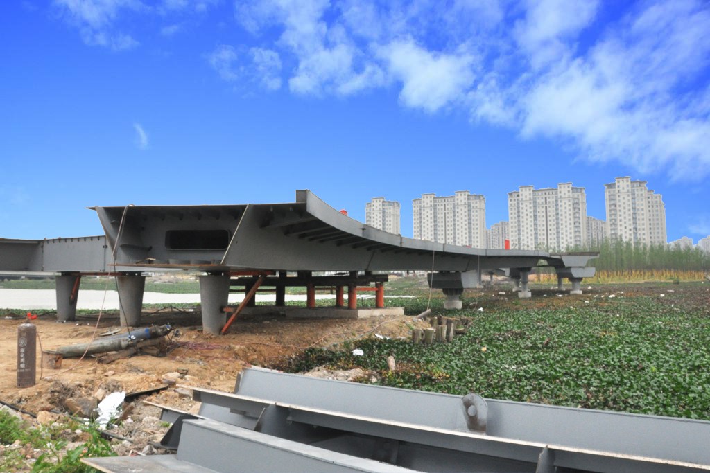 樂清灣3號/4號橋橋?yàn)楫愋芜B續(xù)鋼箱梁結(jié)構(gòu)。第一聯(lián)和第二聯(lián)跨徑布置為(4×30)+(2×21)米,第三聯(lián)為Y型結(jié)構(gòu),左右分支布跨分別為(25.828+2×25)米和(25.761+2×20)。橋梁標(biāo)準(zhǔn)全寬5.0米。上部結(jié)構(gòu)均采用閉口截面焊接鋼箱梁結(jié)構(gòu),第一聯(lián)和第二聯(lián)均采用等寬等高單箱單室截面;第三聯(lián)第一跨采用變寬等高單箱雙室截面,其他跨均采用等寬等高單箱單室截面(具體布置詳見相關(guān)圖紙)。箱梁高度均為1.1米,底板寬度為2.10米,頂板寬度為5.0米,采用斜腹板。箱梁頂板、底板厚度均為16mm,腹板厚度為14mm,箱梁頂板、底板和腹板均設(shè)有縱向加勁肋。箱梁橫向基本每隔2.0米設(shè)置一道橫隔板,橫隔板均按沿橋梁軸線徑向布置,橫隔板厚度為12mm;梁端及橋墩支座位置處均設(shè)置橫隔梁,橫隔梁厚度為20mm和25mm。